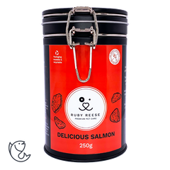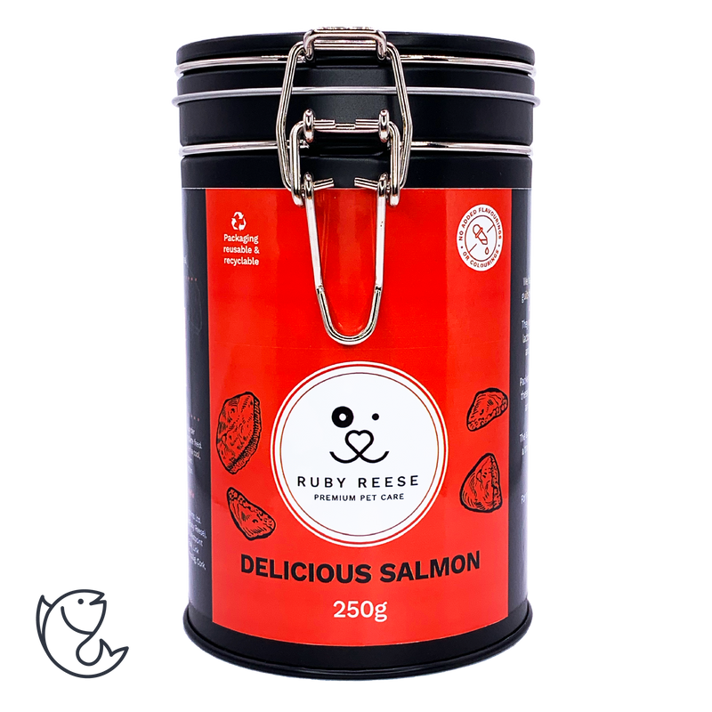 A black tin of RUBY REESE DELICIOUS SALMON natural dog treats with an orange label with some treats spilled in front of it