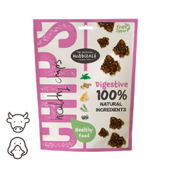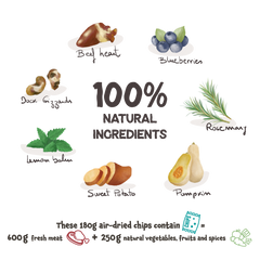 Healthy Chips dog snacks are designed as a healthy complement to any type of diet: raw, home cooked, wet or dry. Inspired by the BARF philosophy, each chip is made with high-quality veal heart, a complementary animal protein (duck gizzards), 10% vegetables, 5% fruits, and selected superfoods like pumpkin, blueberry, turmeric and lemon balm.