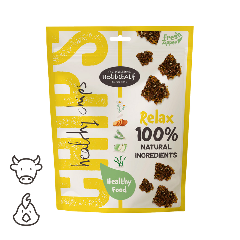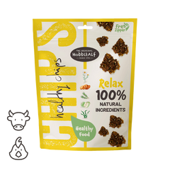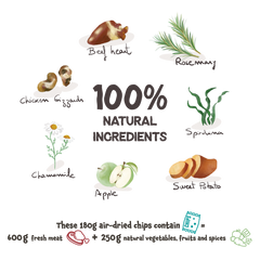 Healthy Chips dog snacks are designed as a healthy complement to any type of diet: raw, home cooked, wet or dry. Inspired by the BARF philosophy, each chip is made with high-quality beef heart, a complementary animal protein (chicken gizzards), 10% vegetables, 5% fruits, and selected superfoods like chamomile, spirulina, apple and sweet potato.