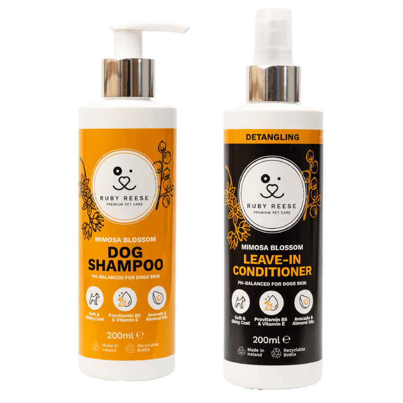 RUBY REESE MIMOSA BLOSSOM DOG SHAMPOO and RUBY REESE MIMOSA BLOSSOM LEAVE-IN CONDITIONER for dogs placed side by side